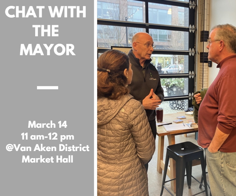 Got a question for Mayor Weiss? On Saturday, March 14, 11 am-12 pm stop by The Van Aken District Market Hall to discuss neighborhood concerns, current City projects, or anything else on your mind.